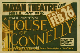 (At least one other Paul Green play was performed in the Federal Theatre--House of Connelly, a story about the dimming fortunes of a wealthy southern family. The poster above advertises a showing at the Mayan Theatre in Los Angeles, 1937. Image courtesy of the Library of Congress Prints and Photographs Division.)