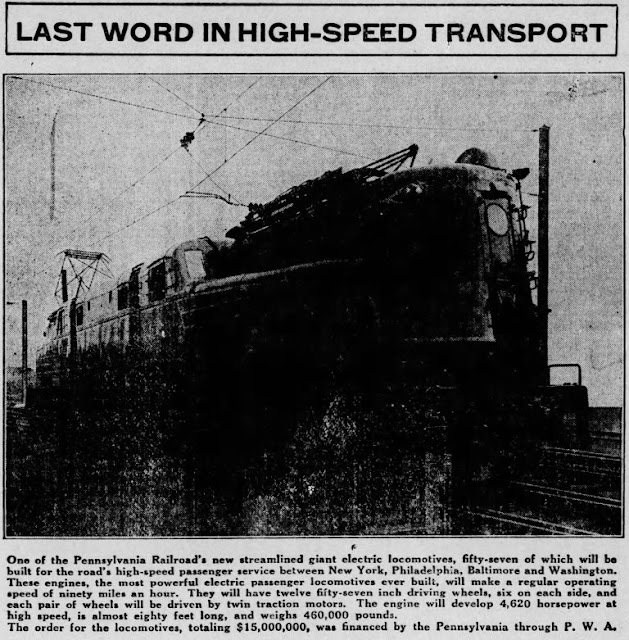 Above: The caption for this photo--which comes from The Perry County Democrat (Bloomfield, Pennsylvania), November 28, 1934-- notes that the 57, PWA-financed, "Old Rivets" style locomotives were, at the time, "the most powerful electric passenger locomotives ever built." Further, an earlier article in The Gazette (Cedar Rapids, Iowa) reported that PWA loans allowed the Pennsylvania Railroad to make "one of the largest equipment orders in the history of American railroading" (November 10, 1934, p. 1). And all of this financing and ordering allowed thousands of railroad workers to return to their jobs, and would benefit about 100 other industries (see, e.g., "Huge Electrification Program of P.R.R. in Full Swing," The News-Herald (Franklin, Pennsylvania), March 28, 1934, p. 1). Photo from newspapers.com, used here for educational and non-commercial purposes.